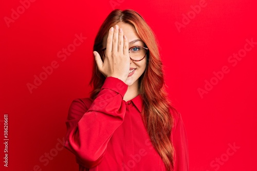 Young beautiful redhead woman wearing casual clothes and glasses over red background covering one eye with hand, confident smile on face and surprise emotion.