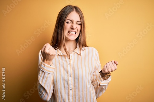 Young beautiful redhead woman wearing casual striped shirt over isolated yellow background excited for success with arms raised and eyes closed celebrating victory smiling. Winner concept.