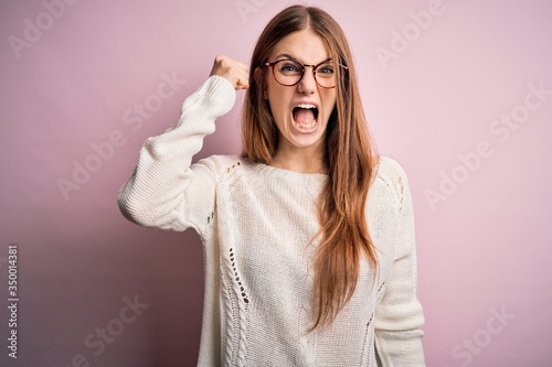 Young beautiful redhead woman wearing casual sweater and glasses over pink background angry and mad raising fist frustrated and furious while shouting with anger. Rage and aggressive concept.