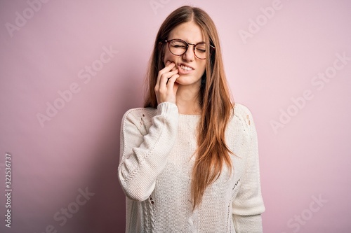 Young beautiful redhead woman wearing casual sweater and glasses over pink background touching mouth with hand with painful expression because of toothache or dental illness on teeth. Dentist