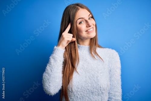 Young beautiful redhead woman wearing casual sweater over isolated blue background Smiling pointing to head with one finger, great idea or thought, good memory