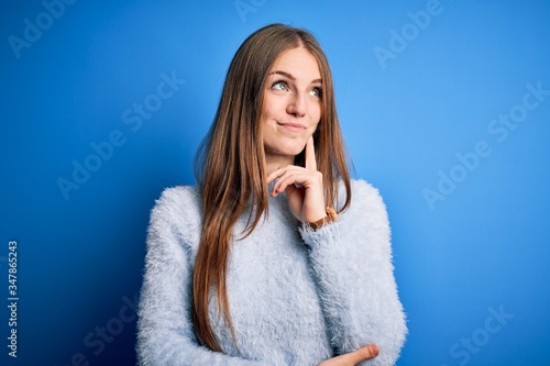 Young beautiful redhead woman wearing casual sweater over isolated blue background with hand on chin thinking about question, pensive expression. Smiling and thoughtful face. Doubt concept.