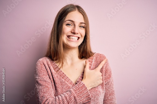 Young beautiful redhead woman wearing casual sweater over isolated pink background cheerful with a smile of face pointing with hand and finger up to the side with happy and natural expression on face