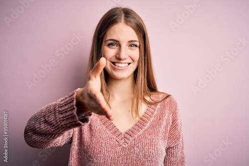 Young beautiful redhead woman wearing casual sweater over isolated pink background smiling friendly offering handshake as greeting and welcoming. Successful business.