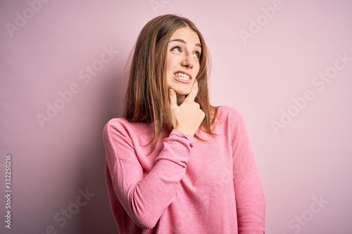 Young beautiful redhead woman wearing casual sweater over isolated pink background Thinking worried about a question, concerned and nervous with hand on chin