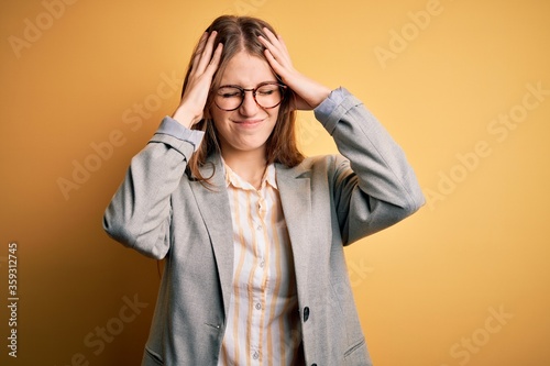 Young beautiful redhead woman wearing jacket and glasses over isolated yellow background suffering from headache desperate and stressed because pain and migraine. Hands on head.