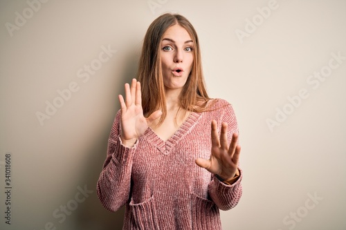 Young beautiful redhead woman wearing pink casual sweater over isolated white background Moving away hands palms showing refusal and denial with afraid and disgusting expression. Stop and forbidden.