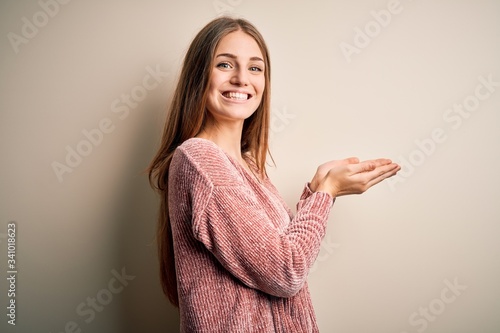 Young beautiful redhead woman wearing pink casual sweater over isolated white background pointing aside with hands open palms showing copy space, presenting advertisement smiling excited happy