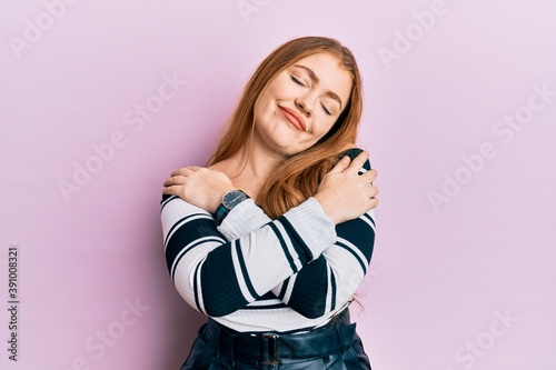 Young beautiful redhead woman wearing striped sweater over pink background hugging oneself happy and positive, smiling confident. self love and self care