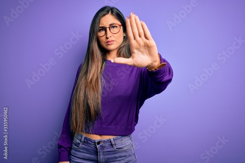 Young beautiful smart woman wearing glasses over purple isolated background doing stop sing with palm of the hand. Warning expression with negative and serious gesture on the face.