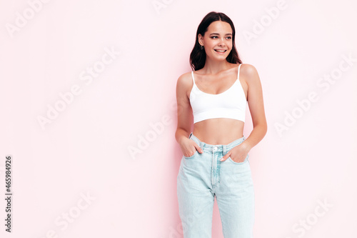 Young beautiful smiling female in trendy summer clothes. Sexy carefree woman posing near pink wall in studio. Positive brunette model having fun and going crazy. Cheerful and happy