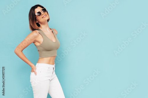 Young beautiful smiling female in trendy summer jeans clothes. Carefree woman posing near blue wall in studio. Sexy positive model having fun indoors. Cheerful and happy. Isolated. In sunglasses