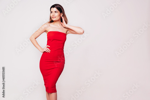 Young beautiful smiling female in trendy summer red evening dress. Sexy carefree brunette woman posing in studio, isolated on white. Positive model with evening makeup. Cheerful and happy