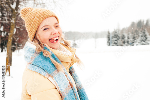 Young beautiful smiling hipster female in trendy warm clothes and scarf.Carefree woman posing in the street in park. Positive pure model having fun in snow. Enjoying winter moments. Shows tongue