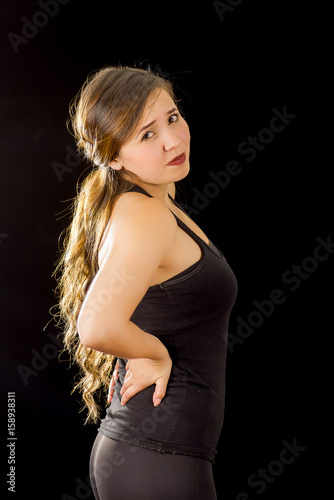 Young beautiful sportwoman suffer cervical pain in her lower back, in black background