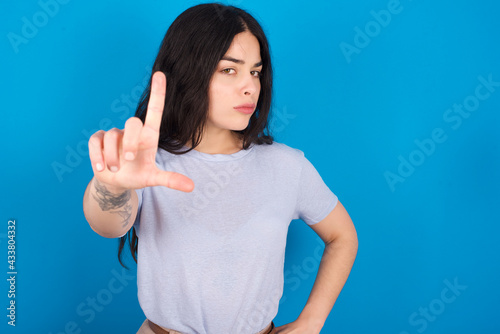 young beautiful tattooed girl wearing blue t-shirt standing against blue background making fun of people with fingers on forehead doing loser gesture mocking and insulting.