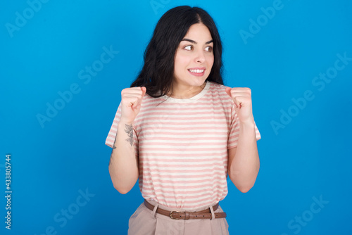 young beautiful tattooed girl wearing pink striped t-shirt standing against blue wall clenches fists and awaits for something nice happened looks away bites lips and waits announcement of results