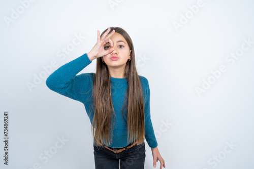 Young beautiful teen girl wearing blue T-shirt doing ok gesture shocked with surprised face, eye looking through fingers. Unbelieving expression.