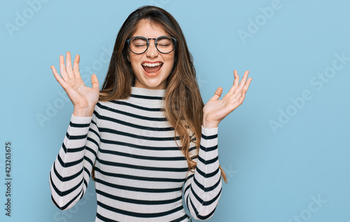 Young beautiful teen girl wearing casual clothes and glasses celebrating mad and crazy for success with arms raised and closed eyes screaming excited. winner concept