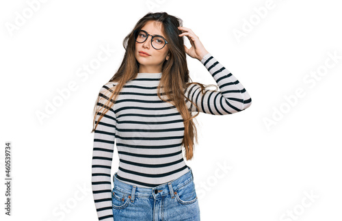 Young beautiful teen girl wearing casual clothes and glasses confuse and wonder about question. uncertain with doubt, thinking with hand on head. pensive concept.