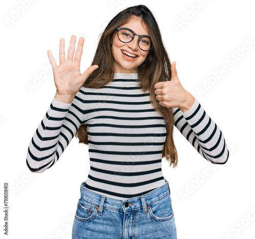 Young beautiful teen girl wearing casual clothes and glasses showing and pointing up with fingers number six while smiling confident and happy.