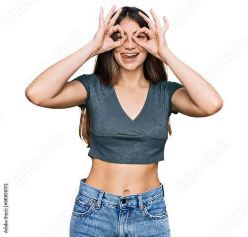 Young beautiful teen girl wearing casual crop top t shirt doing ok gesture like binoculars sticking tongue out, eyes looking through fingers. crazy expression.