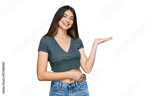 Young beautiful teen girl wearing casual crop top t shirt smiling cheerful presenting and pointing with palm of hand looking at the camera.