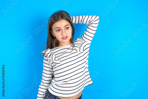 Young beautiful teen girl wearing striped T-shirt being confused and wonders about something. Holding hand on head, uncertain with doubt. Pensive concept.