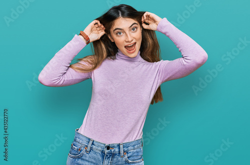 Young beautiful teen girl wearing turtleneck sweater smiling pulling ears with fingers, funny gesture. audition problem