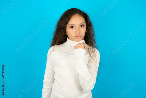 Young beautiful teen girl wearing white turtleneck over blue background shows fist has annoyed face expression going to revenge or threaten someone makes serious look. I will show you who is boss