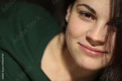 Young beautiful white dark-haired girl in a green T-shirt lies smiling on the bed