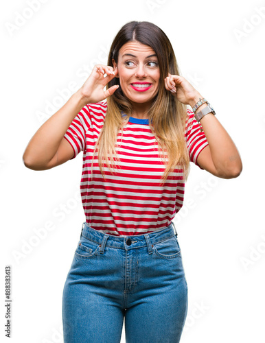 Young beautiful woman casual look over isolated background covering ears with fingers with annoyed expression for the noise of loud music. Deaf concept.