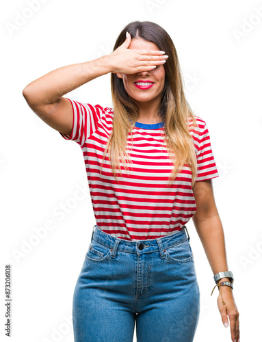 Young beautiful woman casual look over isolated background smiling and laughing with hand on face covering eyes for surprise. Blind concept.