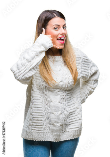 Young beautiful woman casual white sweater over isolated background smiling doing phone gesture with hand and fingers like talking on the telephone. Communicating concepts.