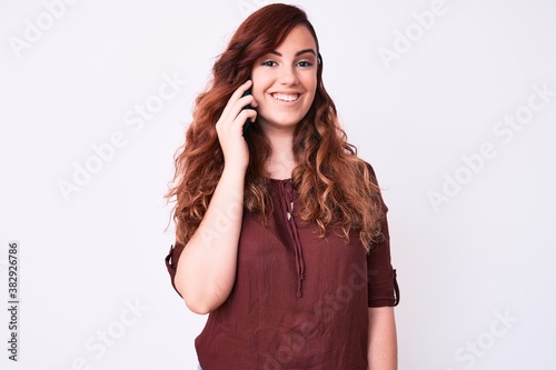 Young beautiful woman having conversation talking on the smartphone looking positive and happy standing and smiling with a confident smile showing teeth