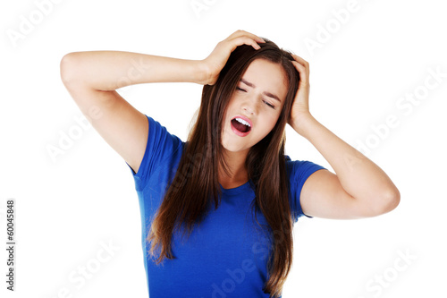 Young beautiful woman having terrible headache.