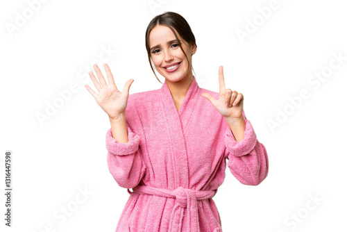 Young beautiful woman in a bathrobe over isolated chroma key background counting seven with fingers