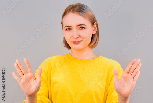 Young beautiful woman in yellow sweater making the hand stop sign, isolated on the gray background. close up photo. calm down, please. Don't worry