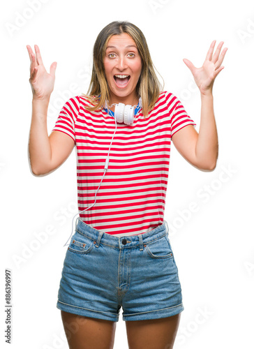 Young beautiful woman listening music wearing headphones over isolated background celebrating crazy and amazed for success with arms raised and open eyes screaming excited. Winner concept
