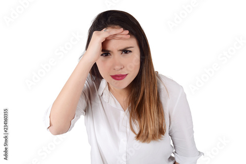 Young beautiful woman looking into the distance. Isolated white background