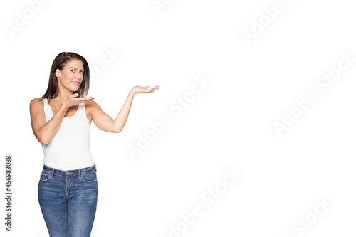 Young beautiful woman on isolated background amazed and smiling at camera while presenting with hand.