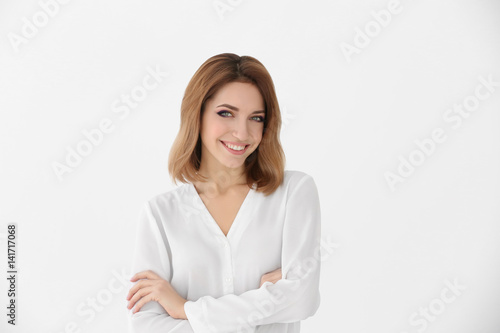 Young beautiful woman on white background