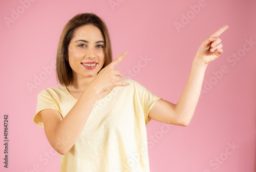 Young beautiful woman over isolated background smiling and pointing with two hands and fingers to the side.