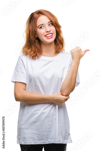 Young beautiful woman over isolated background smiling with happy face looking and pointing to the side with thumb up.