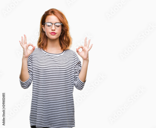 Young beautiful woman over isolated background wearing glasses relax and smiling with eyes closed doing meditation gesture with fingers. Yoga concept.