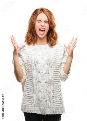 Young beautiful woman over isolated background wearing winter sweater celebrating mad and crazy for success with arms raised and closed eyes screaming excited. Winner concept