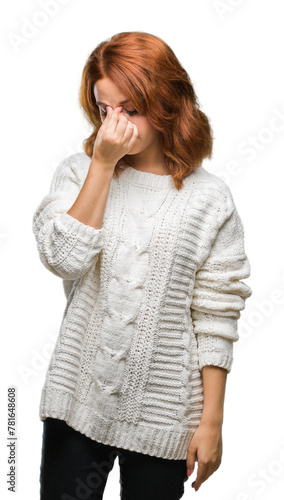 Young beautiful woman over isolated background wearing winter sweater tired rubbing nose and eyes feeling fatigue and headache. Stress and frustration concept.