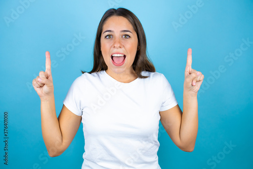 Young beautiful woman over isolated blue background amazed and surprised looking at the camera and pointing up with fingers and raised arms