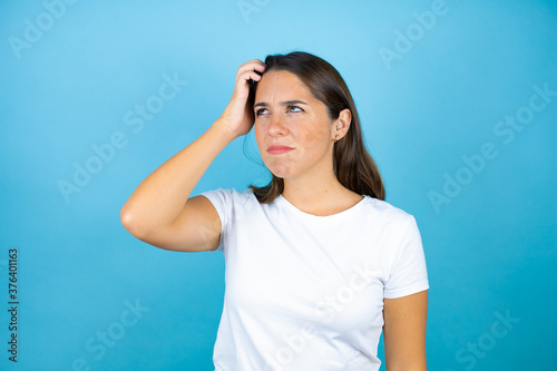Young beautiful woman over isolated blue background confuse and wonder about question. Uncertain with doubt, thinking with hand on head