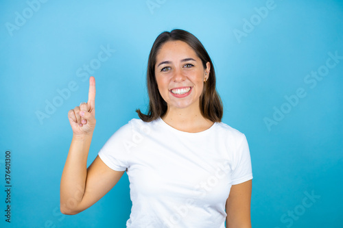Young beautiful woman over isolated blue background showing and pointing up with fingers number one while smiling confident and happy